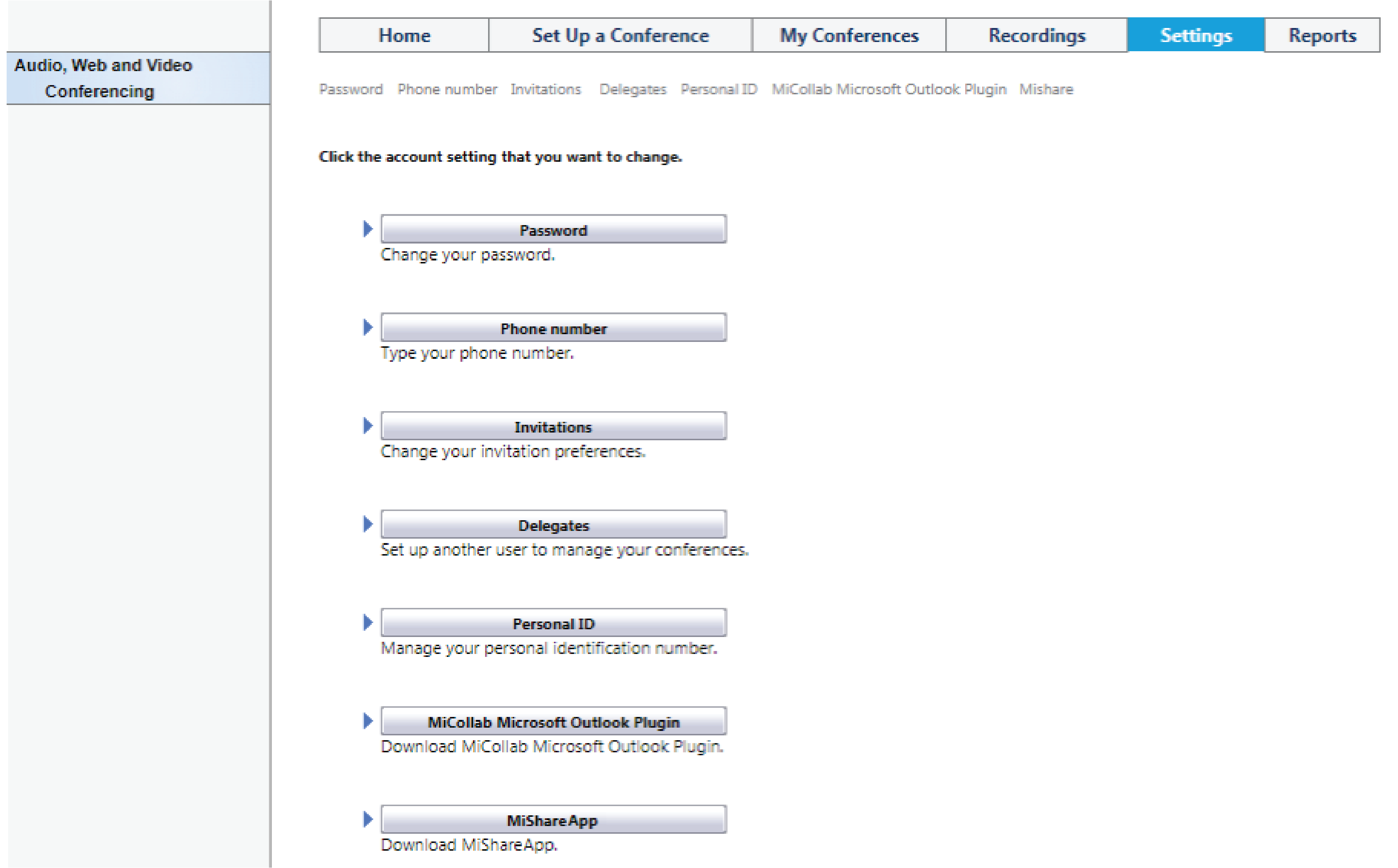 Password: Allows you to change are MiCollab Audio, Web and Video Conferencing account password.